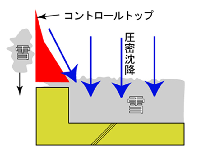 しかし、スノーセイバの傾斜方向に沿って雪の沈降現象が起こり、付着した雪庇は小さな状態のまま切り落とされます。