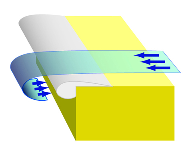 パラペットを通過した雪を含んだ風が、下に巻き込む渦となりパラペット付近に雪が付着して発生・成長すると考えられています。