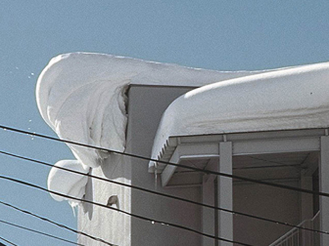 積雪地域では屋根の風下側のパラペット(軒先)部に雪がせり出し、垂れ下がる現象が起こります。このせり出した雪が雪庇です。